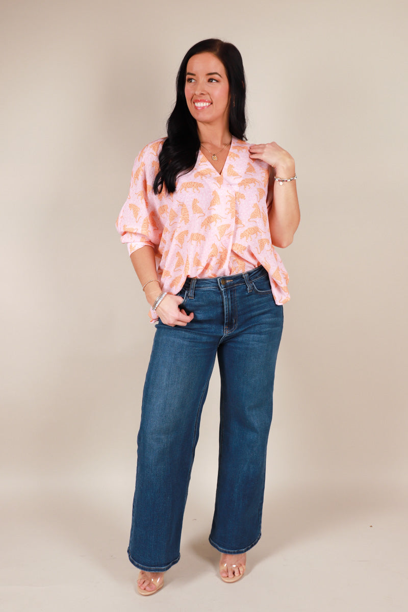 A timeless blouse that will never go out of style. The Sabine Top is a vibrant addition to your spring wardrobe, perfect for Easter festivities or a boho chic vacation look. Featuring a graphic pattern and a flattering V-neckline, this blouse has three-quarter sleeves for a touch of elegance. Its multi-color design adds a playful pop to any outfit.