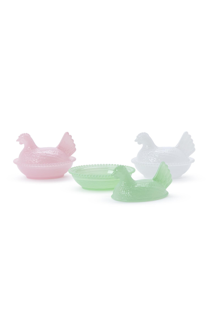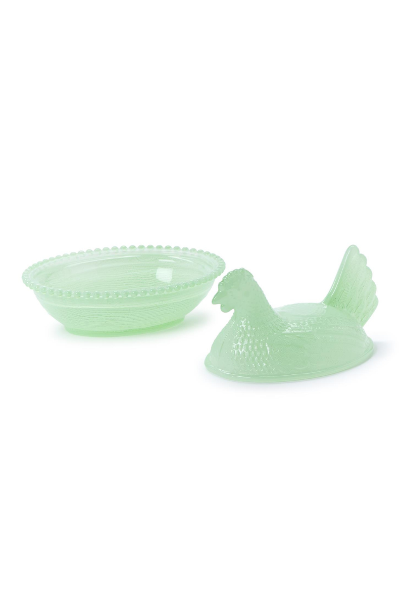 • Glass hen lid with matching nest dish