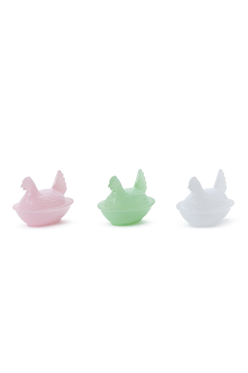 Our Hen on Nest Covered Dish is the perfect blend of vintage-inspired style and fresh seasonal color. Featuring a beautifully detailed glass hen lid resting on a matching nest dish, this piece is both decorative and functional — ideal for holding treats, trinkets, wrapped candy, or Easter goodies.