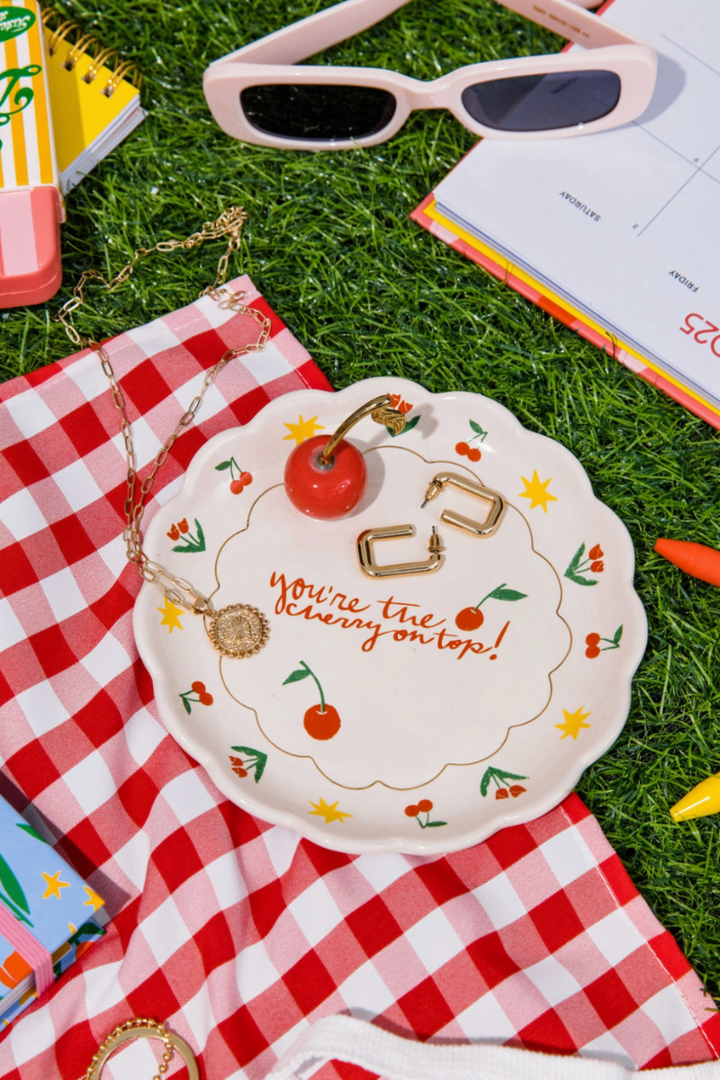 Keep your favorite jewelry and small essentials organized in the sweetest way with our Cherry On Top Trinket Tray. Featuring a charming cherry motif and playful message, this decorative tray adds a bright, cheerful accent to vanities, nightstands, or desks while keeping everyday pieces within reach.