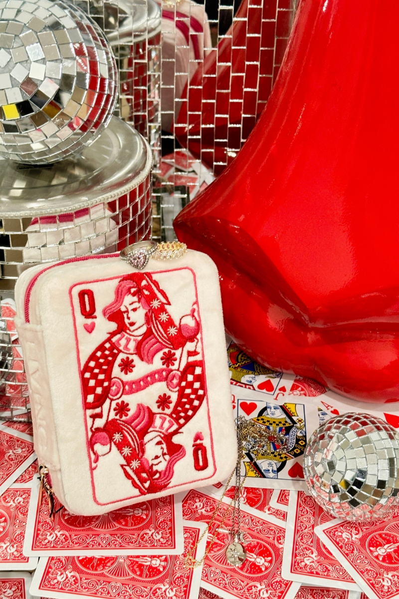 Our Queen of Hearts Velvet Jewelry Case is the perfect mix of playful and pretty, featuring a stunning embroidered playing card design in shades of pink and red on a soft white velvet exterior.