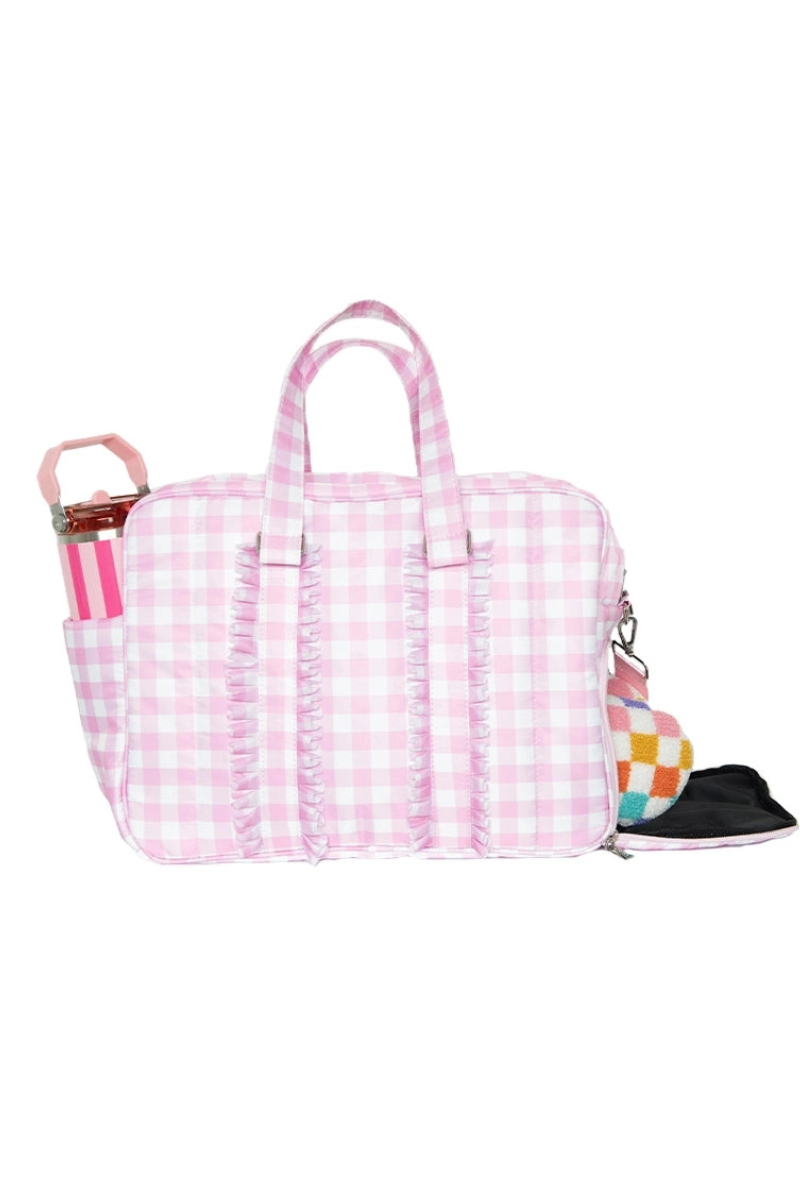 Add a pop of girly charm to your style with the Pink Gingham Weekender Bag, a must-have gingham weekender bag for stylish travelers. Featuring a soft gingham print with ruffle trim, this ruffle duffel bag blends pretty and practical, with a roomy interior, a shoe compartment, and a luggage pass-through slip. Lightweight, quilted, and oh-so-photogenic, it’s the kind of bag that flies off shelves in spring and summer.