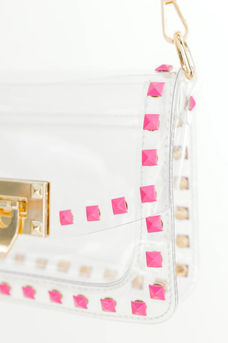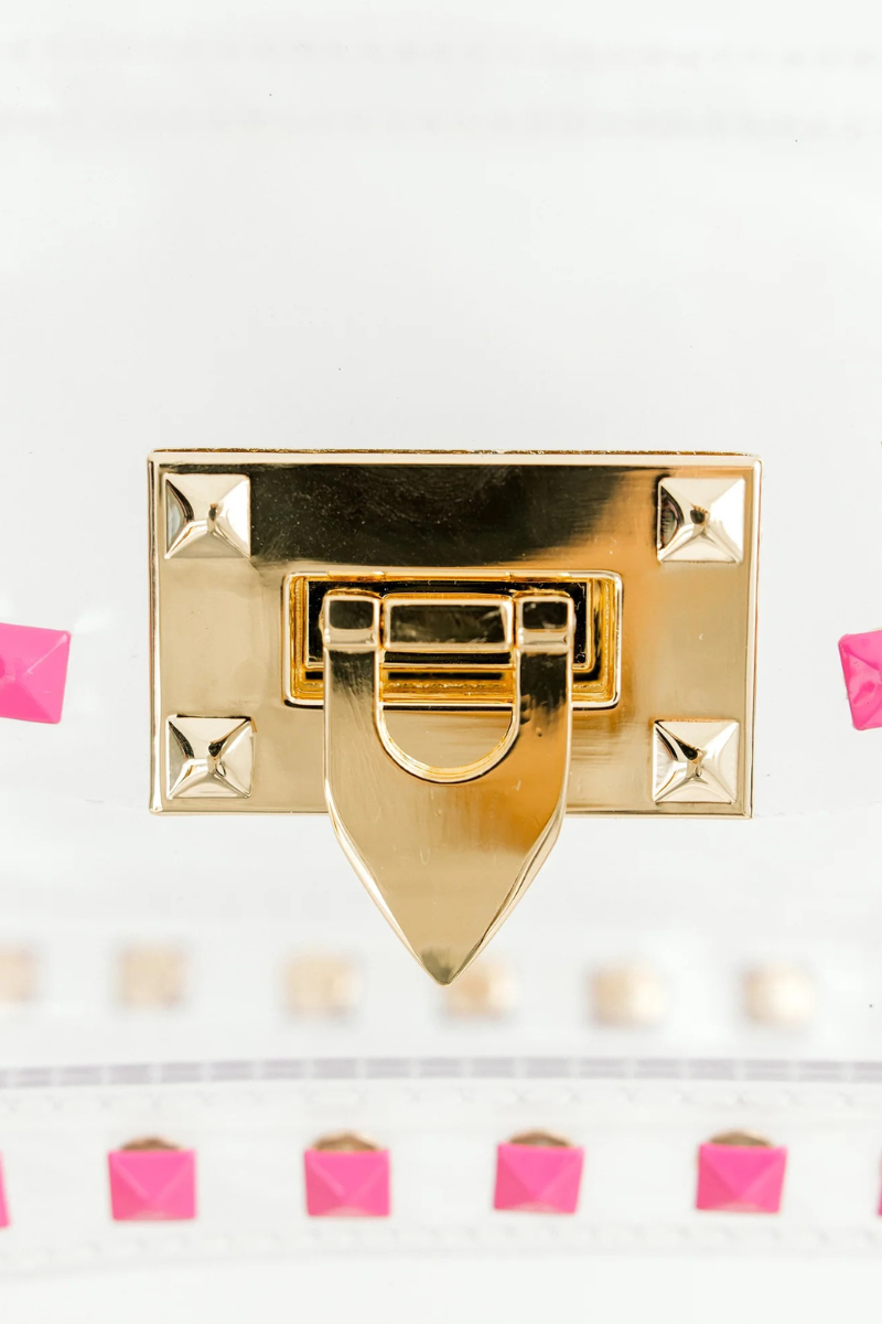 Score with the biggest winner in our clear handbag playbook - The Jackie! The Jackie changed the handbag game by proving clear handbags could be both functional and chic. This style includes bright pink square metal studs and a gold chain.