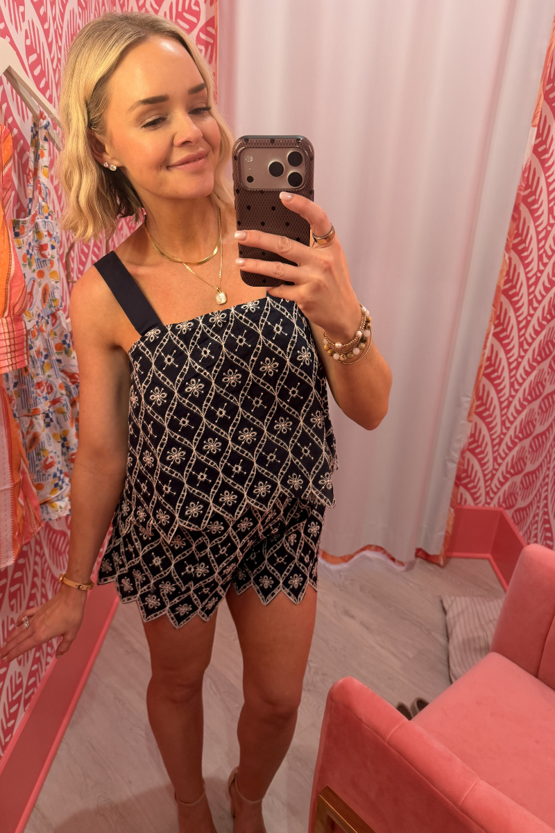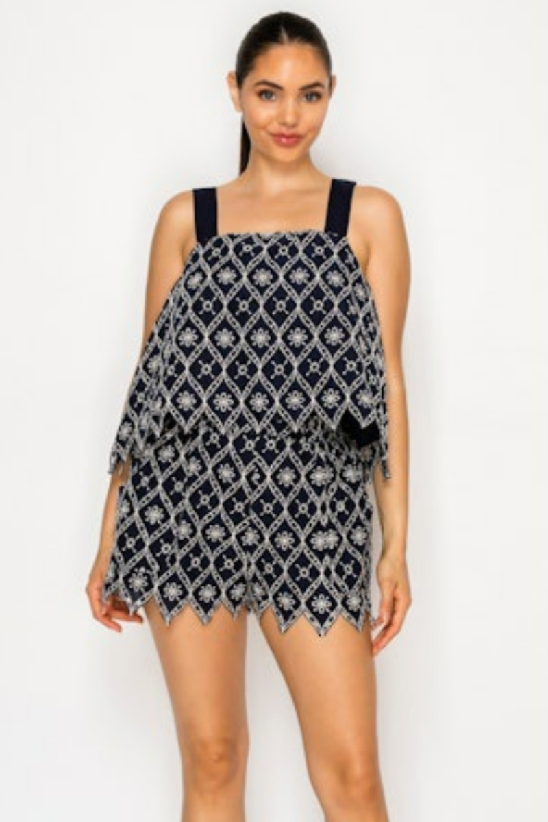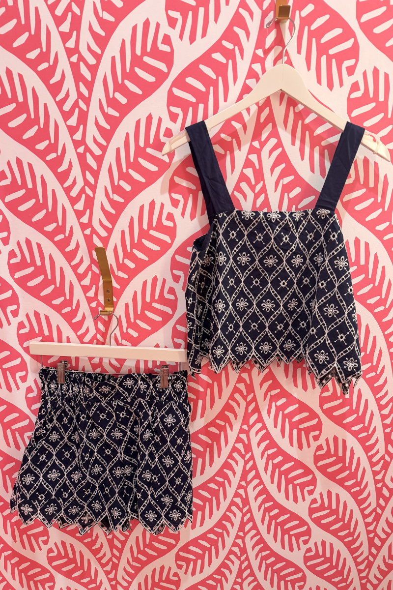 The Selene’s Embroidery Set exudes moody, coastal elegance in deep navy with intricate ivory embroidery. The tiered camisole features a modern square neckline and a laser-cut scalloped hem, while the matching high-waisted shorts are finished with coordinating laser-cut scalloped edges, creating a polished and romantic look ideal for evening strolls or upscale coastal dinners.