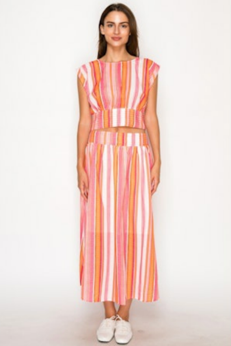 Bright, bold, and made to stand out, the Sirocco Stripe Set features vibrant stripes of sunset orange, bubblegum pink, and crisp white for a playful, feel-good look! The cropped top showcases a high neckline with a comfortable smocked hem, while the matching high-waisted midi skirt includes a wide smocked waistband for a flattering, flexible fit. Crafted from lightweight, breathable fabric, this set keeps you cool and stylish from sunny daytime outings to warm evening plans.