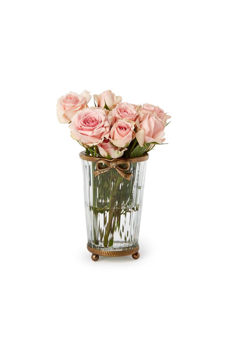 Add a touch of vintage allure to your home with this antique gold–finished hand-cut glass vase. Intricate glass detailing and a graceful brass bow accent create a statement piece that feels equally at home in classic or contemporary spaces.