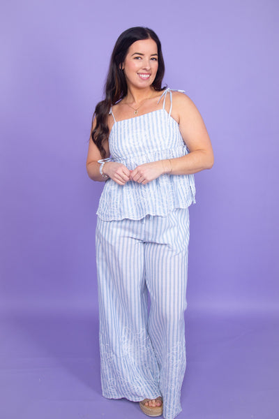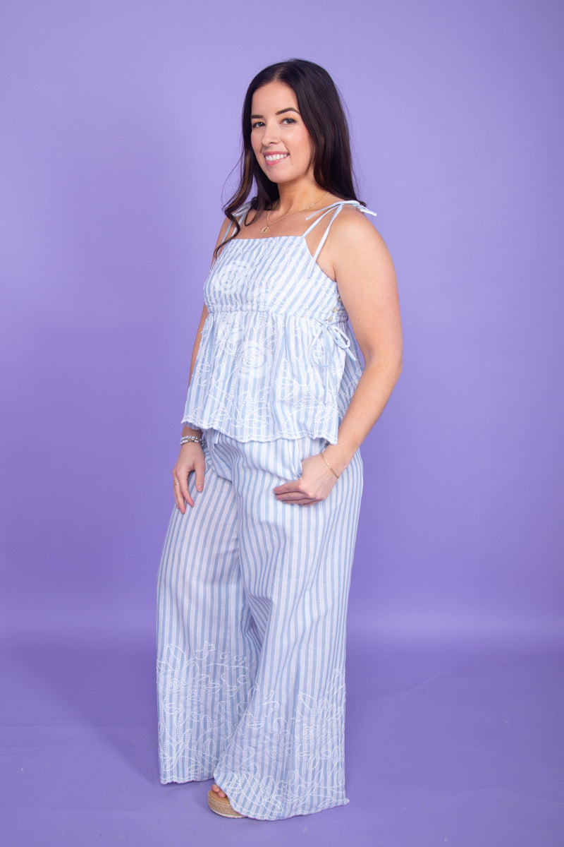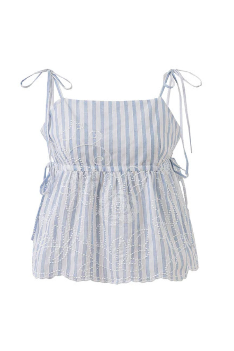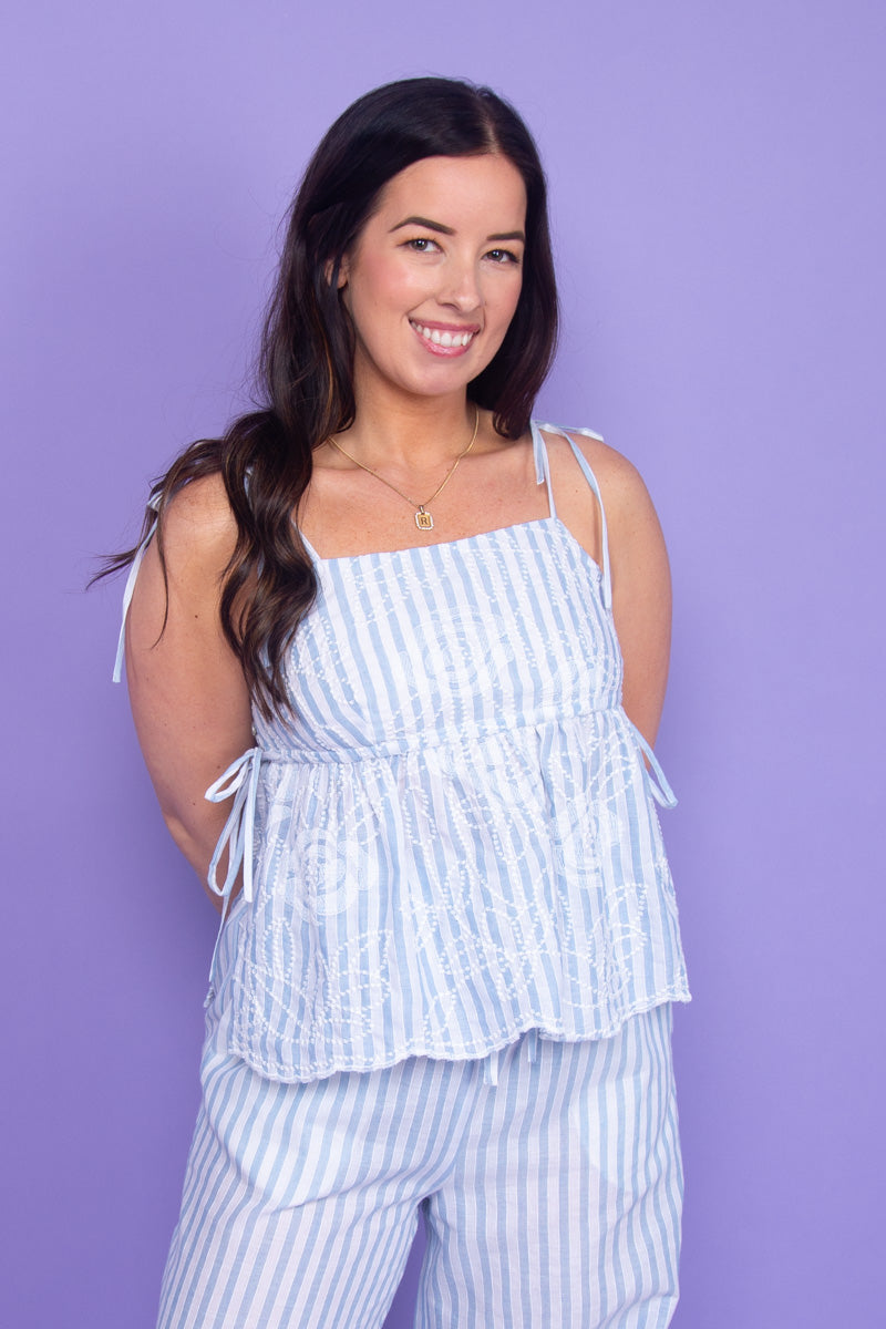 Light, airy, and oh-so-dreamy — this striped tank is your new summer favorite. Featuring baby blue and white vertical stripes, delicate white embroidery, and the sweetest details like adjustable shoulder ties and side buttons with a dainty waist bow, this top has a flattering, peplum-style silhouette that's equal parts breezy and feminine. Pair it with the matching Camomille Trousers or your favorite denim for an effortless look that feels straight out of a seaside daydream.