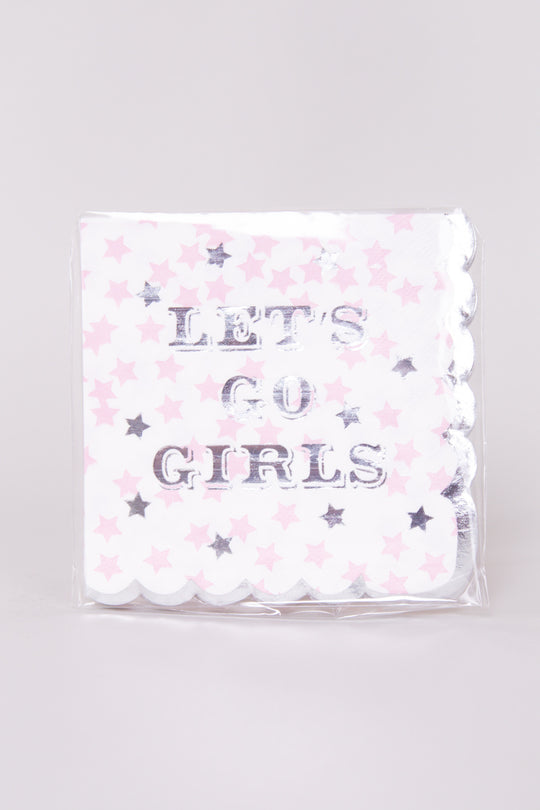 Add a fun & fabulous conversation starter to any table, bathroom, or bar cart with this set of fun paper napkins. Each napkin features scalloped edges and writing that says, "Let's Go Girls."